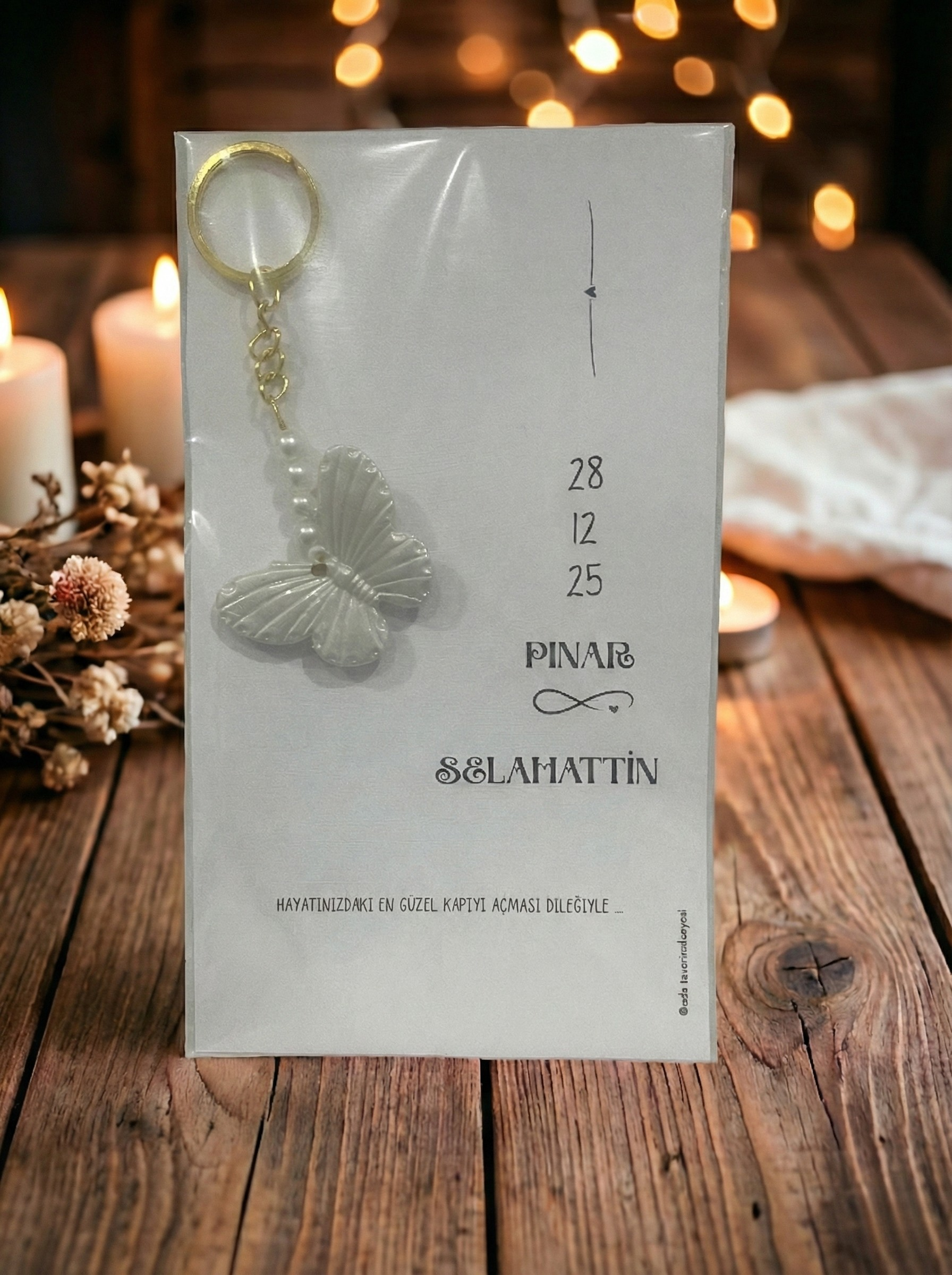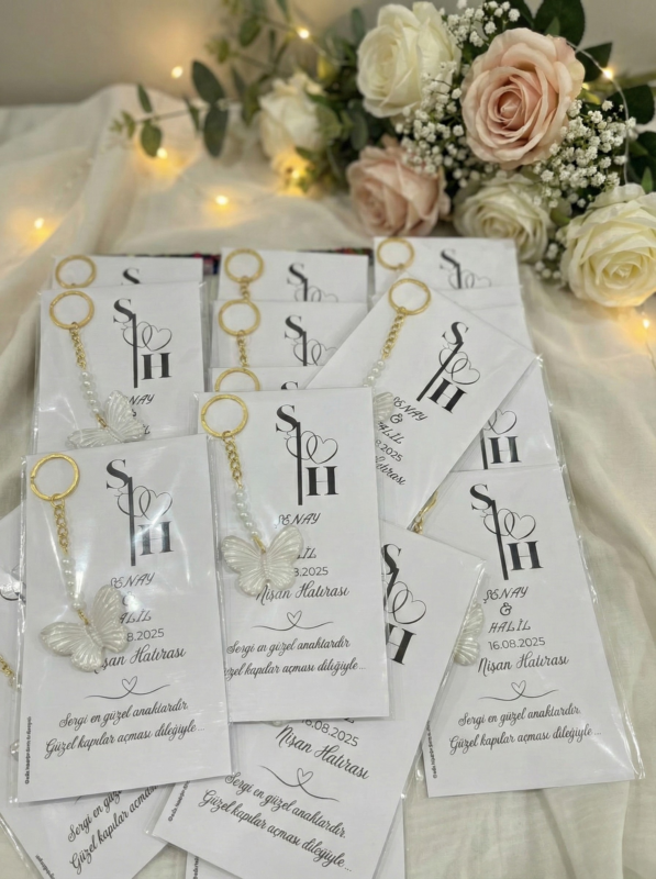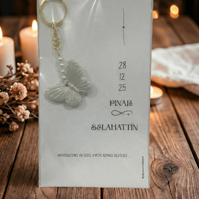 Kişiye Özel Tasarım Kartlı İncili Kelebek Anahtarlık Hediyelik